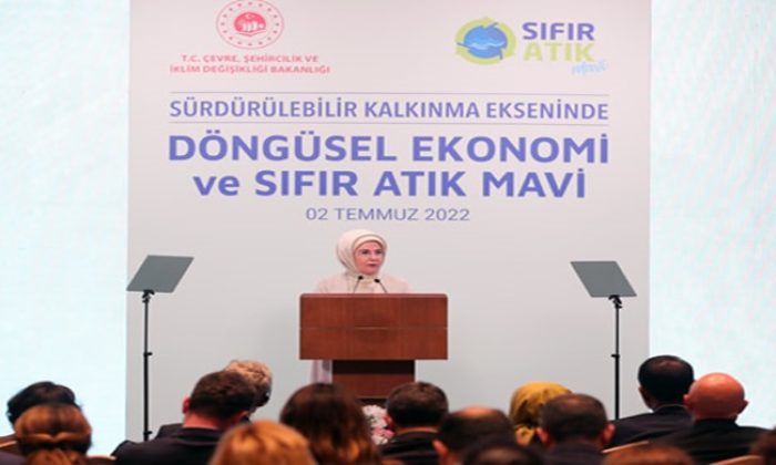 Cumhurbaşkanı Recep Tayyip Erdoğan’ın eşi Emine Erdoğan, Çevre, Şehircilik ve İklim Değişikliği Bakanlığı tarafından Birleşmiş Milletler (BM) Sürdürülebilir Kalkınma Çözümleri Ağı destekleriyle Cumhurbaşkanlığı Dolmabahçe Çalışma Ofisi Konferans Salonu’nda düzenlenen “Sürdürülebilir Kalkınma Ekseninde Döngüsel Ekonomi ve Sıfır Atık Mavi” programında konuştu.