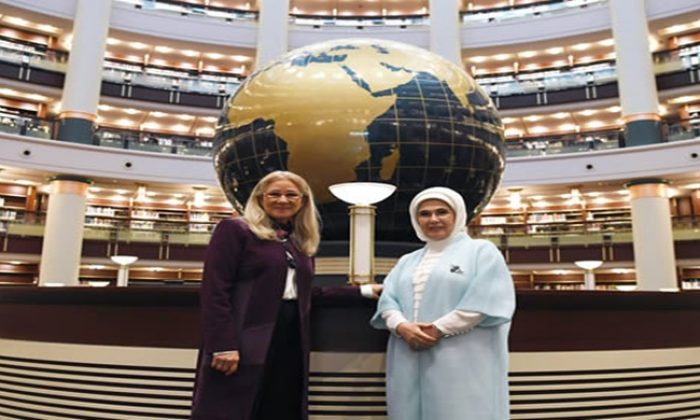 Ardından iki First Lady, Cihannüma Salonu’nu gezdi ve burada bulunan yerkürenin önünde fotoğraf çekildi.