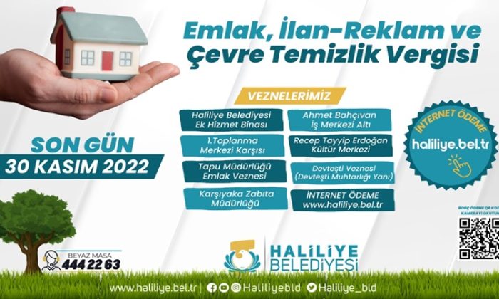 Haliliye Belediyesi, Emlak, İlan- Reklam ve Çevre Temizlik Vergisi ödemelerinde son günün 30 Kasım olduğunu ve ödemelerin internetten kolaylıkla yapılabileceğini duyurdu.