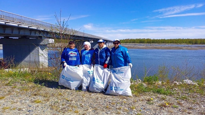 Birleşik Rusya aktivistleri nehir ve Magadan-Balagannoye-Talon otoyolu boyunca yaklaşık iki kilometre yürüyerek 25 torba çöp topladı.