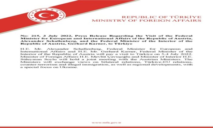 No: 215, 3 July 2022, Press Release Regarding the Visit of the Federal Minister for European and International Affairs of the Republic of Austria, Alexander Schallenberg, and the Federal Minister of the Interior of the Republic of Austria, Gerhard Karner, to Türkiye